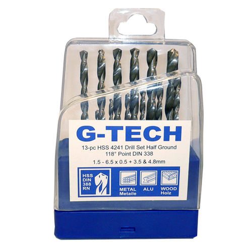 M13: G-Tech HSS Drill Set 13pcs/set, in plastic case. Sizes are 1.5 to 6.5mm x 0.5mm plus 3.20mm and 4.8mm.